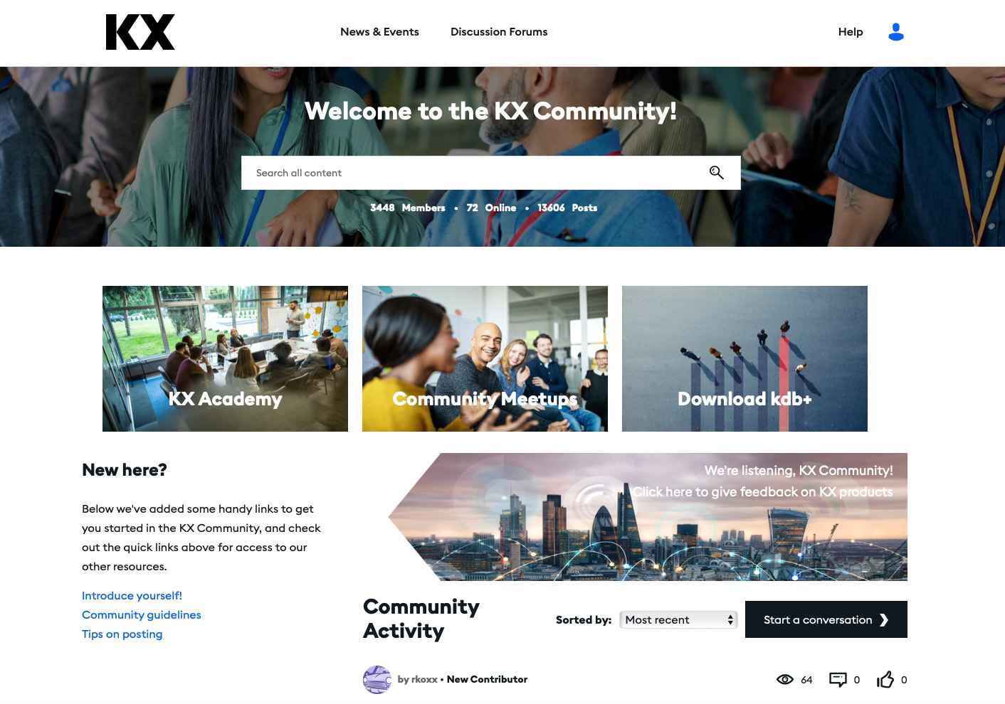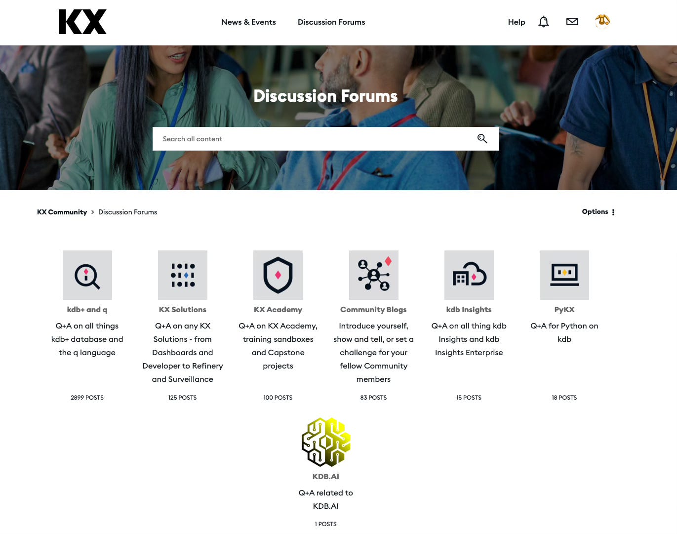 In my opinion, the KX Community serves as an excellent resource for assistance when you encounter challenges. Additionally, it provides a valuable platform for acquiring knowledge about prevalent issues and their corresponding resolutions. Whether you're striving to comprehend the intricacies of KDB/Q, grappling with an architectural design query, or seeking insights into any of the KX products, this forum proves highly beneficial.