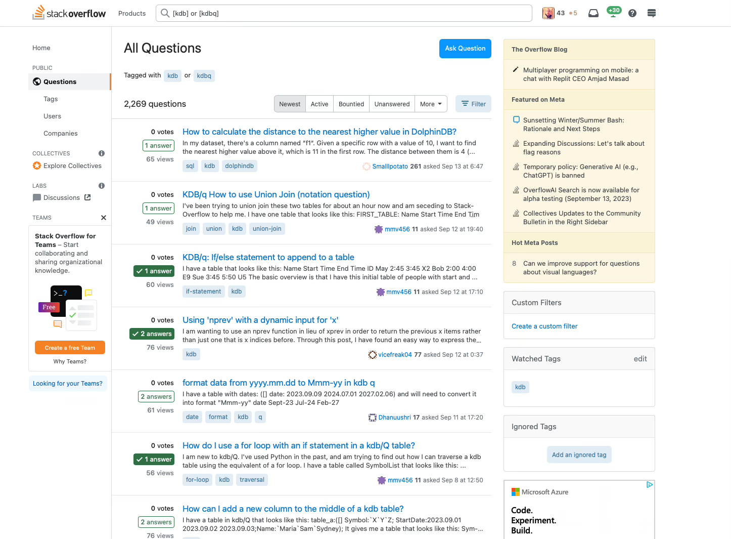 The relatively limited number of KDB/Q questions on StackOverflow is combined with a lack of a robust categorization. While I consider StackOverflow a valuable platform for posting questions, I must also acknowledge that it may not offer the same level of structured organization as the KX Community. However, it's worth mentioning that there is an active participation from experienced developers who consistently respond to KDB/Q queries, and I've personally come across valuable solutions and code snippets within the StackOverflow KDB/Q section as well.